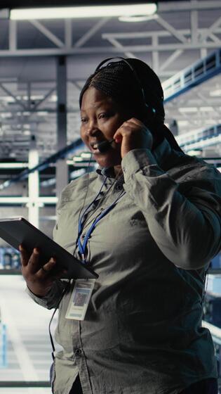 Vertical Data center system administrator uses AI on tablet to help customers resolve website hosting problems. African american woman in server farm helps users keep online services running smoothly, camera A Pro Video