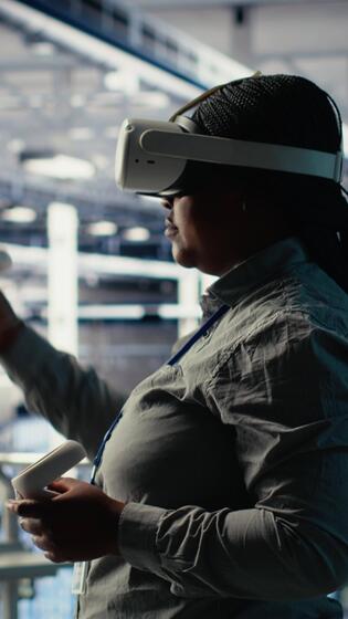 Vertical Data center technician using virtual reality, improving AI rigs processing speed. Server hub IT expert using VR headset to manage gear providing support for artificial intelligence workloads, camera B Pro Video