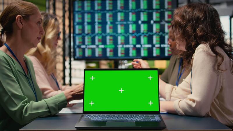 Team of businesswomen creates a strategy next to chroma key display with big TV monitor open and planning documents on the table. Showcasing business operations efficiency. Camera A. Pro Video