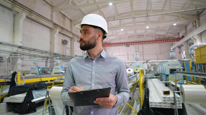 Window factory engineer inspecting production line and taking notes on clipboard Pro Video