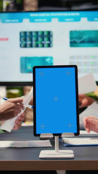 Vertical Businesswomen use a copy space display and charts to pitch career vision, transforming isolated space into interactive charts, goals and insights as part of strategic work environment. Camera A. Pro Video