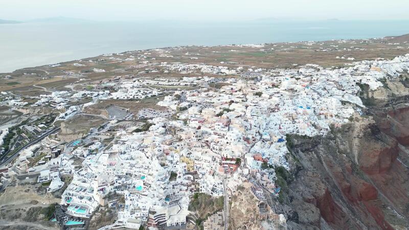 Curved Drone Flight Above Oia, Santorini - Scenic View of Cycladic Architecture Pro Video