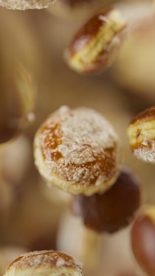 Animation of a group of donuts. Many donuts slowly rotate in the background in space. Vertical composition. Defocus. Close-up Pro Video