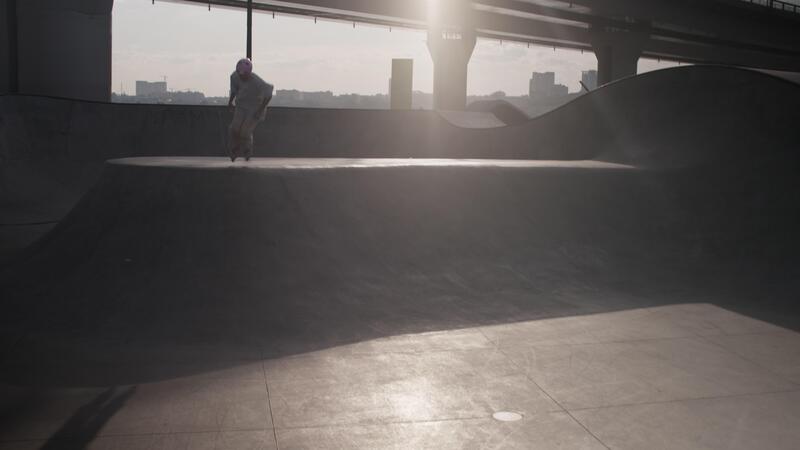 Rollerblader in helmet skates in empty stone bowl near bridge Pro Video