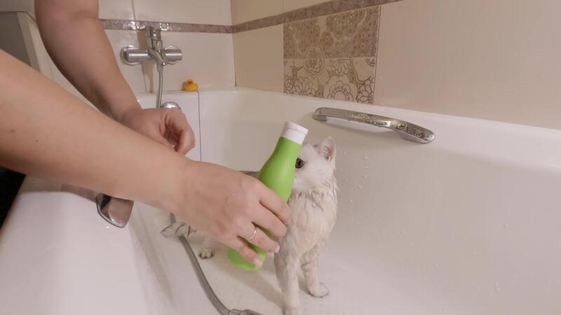 Calm routine for a bath with a cat, the owner gently applies a shampoo from fleas on a cat in a bath Pro Video