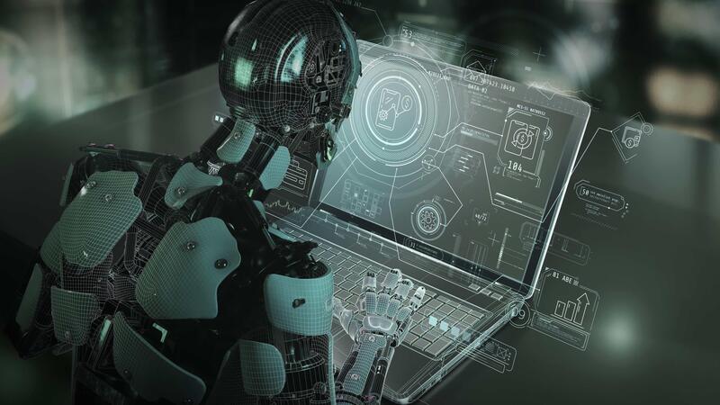 Robot using laptop with holographic interface, analyzing data Pro Video