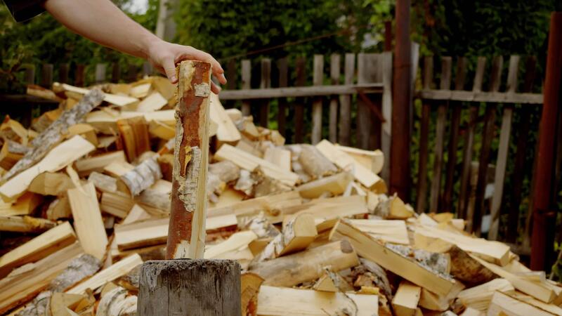 A man is cutting firewood with a sharp axe, but the axe gets stuck in the wood, causing him to have to make extra effort to split the log. Pro Video