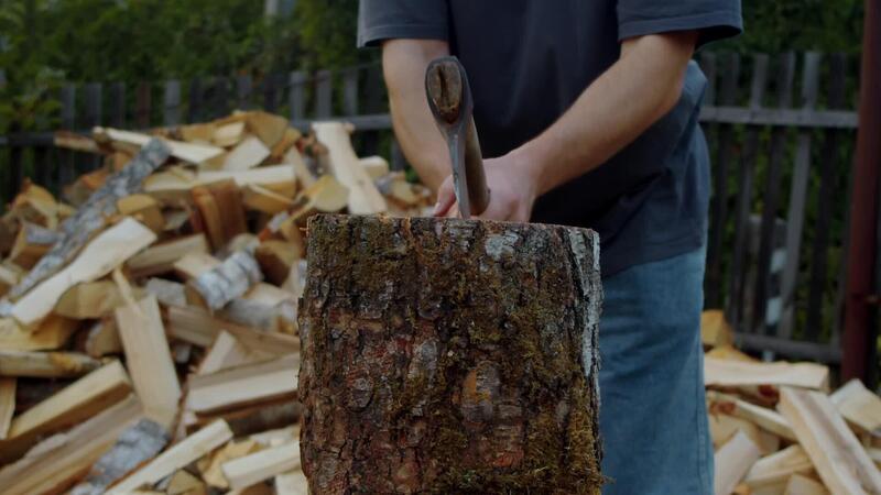 Man precisely positions axe on log and delivers blow, attempting to cleave wood in two. Yet, the axe becomes lodged in the log. Pro Video