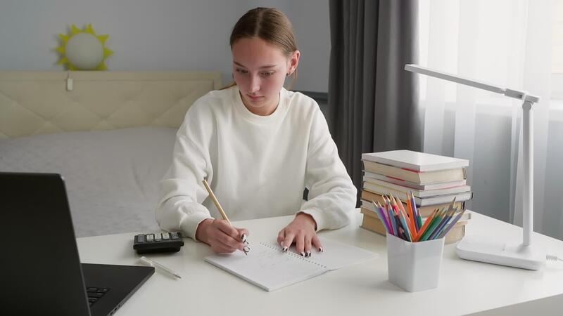 Student studying intensively, using laptop, calculator, and notebook at white table, focusing on educational tasks with concentrated effort Pro Video
