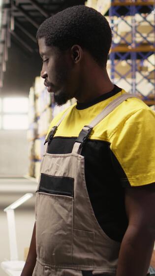Vertical Warehouse worker inspecting cargo details on racks in a large scale fulfillment center, ensuring safety protocols in proper workwear. Logistics management and dispatch in action. Camera A. Pro Video