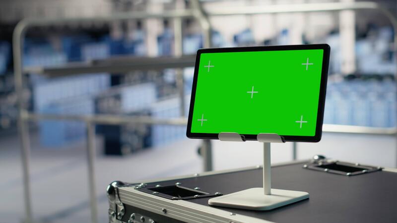 Close up of green screen tablet in front of data center engineers improving AI rigs. Server hub colleagues manage gear using mockup device to support artificial intelligence workloads, camera B Pro Video