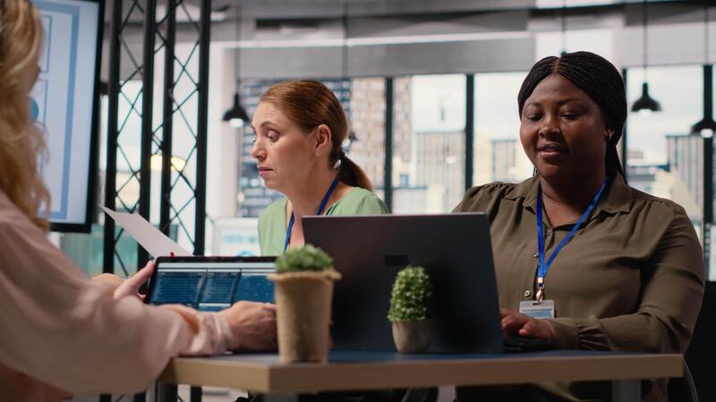 Black businesswoman sitting at boardroom table and solving tasks, immersed in report writing during a briefing with her team. Using analytics and indicators to plan a successful project. Camera B. Pro Video