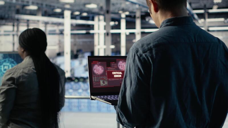 Engineer in server room receives critical error popup on laptop screen, dealing with urgent system issues. Data center worker gets notification about hardware problems affecting performance, camera B Pro Video