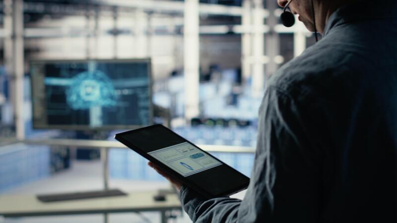 Data center technician using AI on tablet to help customers resolve website hosting problems. Server farm tech support professional helping users keep their online services running smoothly, camera B Pro Video