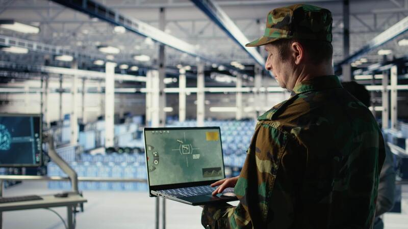 Military technician in data center tracking satellite coordinates using notebook software interface. Army unit in server hub analyzing reconnaissance data through satellite imaging systems, camera A Pro Video