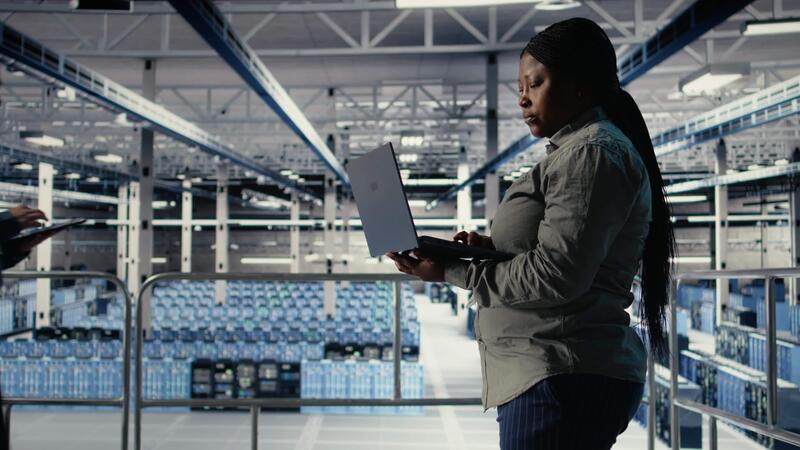 Data center admin investigates AI configurations using laptop, making adjustments to ensure optimal function. African american woman in server hub checks deep learning errors reports, camera A Pro Video