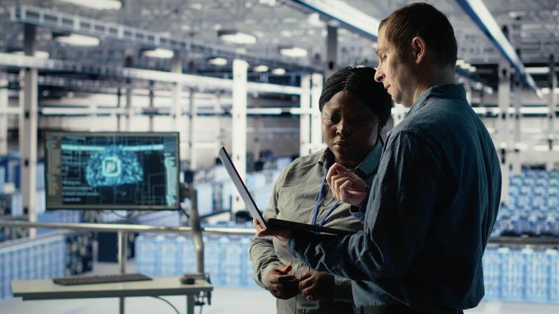 Team of engineers in server hub optimizing deep learning AI systems handling tasks. Teamworking data center colleagues adjust artificial intelligence model parameters using device, camera B Pro Video