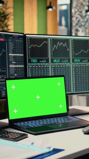 Vertical Day trader in brokerage office analyzes stock market charts on isolated screen laptop, making buy and sell decisions. Expert places client orders using trading software on mockup notebook, camera A Pro Video