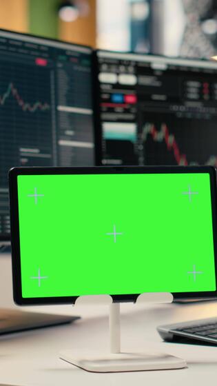 Vertical Stock market metrics charts displayed on isolated screen tablet in investment firm office. Workstation in forex company workspace with live financial data visible on mockup device Pro Video