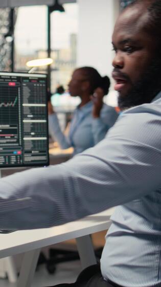 Vertical Distressed brokerage firm trader making phone calls to clients in response to Black Swan event shock. African american man evaluate stock exchange impact of unexpected recession, camera A Pro Video