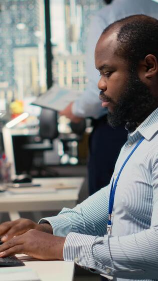 Vertical Trader in office alerted by suspicious hacking alert on trading platform dashboard. Brokerage company worker detects hacking attempt on trading software and initiates security protocols, camera B Pro Video