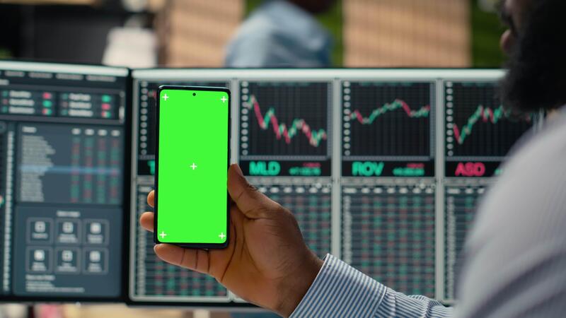 Trader in prop firm office attends virtual meeting using green screen mobile phone. African american man at work using chroma key mobile phone to participate in internet teleconference, camera B Pro Video