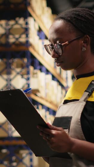 Vertical E-commerce female employee checking parcel details on clipboard, processing orders for shipment process. Overseeing cargo inventory and generating labels for large scale activity. Camera B. Pro Video