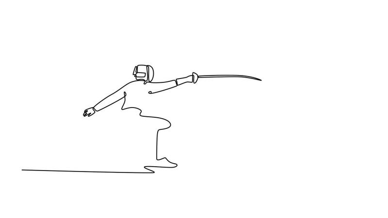 Self drawing animation of single line draw two fencers are engaged in sword clash. Symbolizing strategic balance of attack, defense, sport, and competition. Continuous line draw. Full length animated Pro Video
