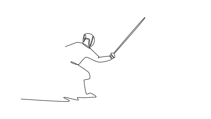 Self drawing animation of single line draw attractive two fencers in a dynamic lunge and parry. Symbolizing elegant movement and strategic skill of action. Continuous line draw. Full length animated Pro Video