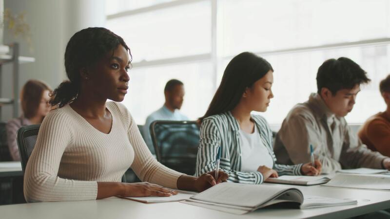 Diverse students focus on their studies in a bright, modern university classroom. They collaborate on assignments while seated at tables, fostering a supportive educational environment. Pro Video