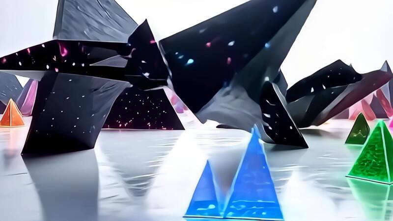 See an array of angular pyramids that twist and reshape, the angular molecule shifting like alien star engine transforming in a continuous flow, with sharp contrasts between dark shades and Free Video