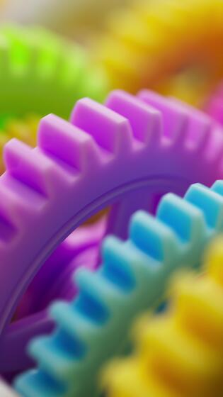 3D looped close up of bright plastic gears rotating within a large interconnected mechanism, with vivid colors and a soft focus effect. Pro Video
