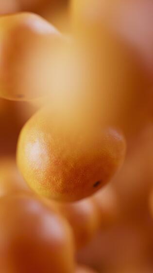 Looping animation of a group of mandarin. Many tangerines slowly rotate in the background in space. Vertical composition. Defocus. Close-up. Cycle. Pro Video