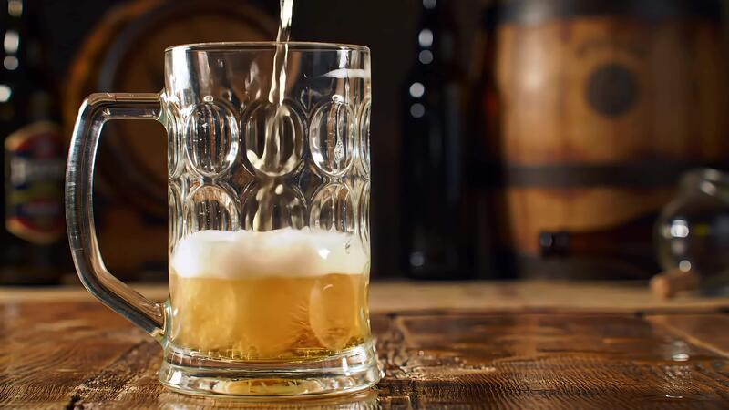 Pouring beer into a dimpled glass mug on a wooden table with barrels in the background in a bar setting Free Video