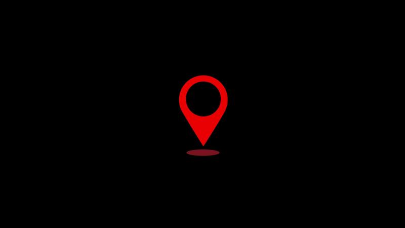 Animated map pointer with gps icon and circular shadow on black background. Pro Video