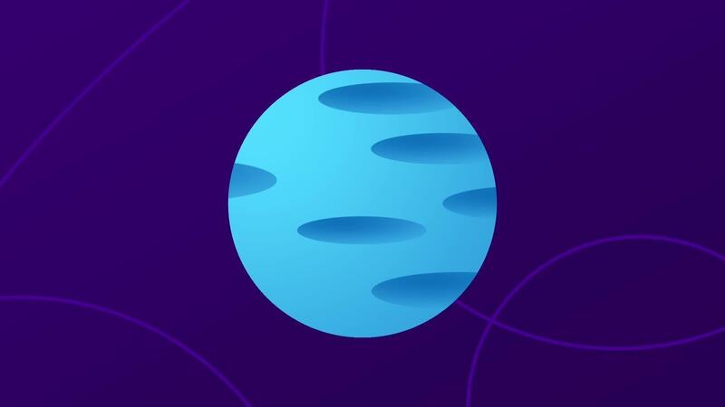 Stylized minimal view of a distant glowing blue planet surrounded by orbiting wave lines set in a mysterious cosmic space background Free Video