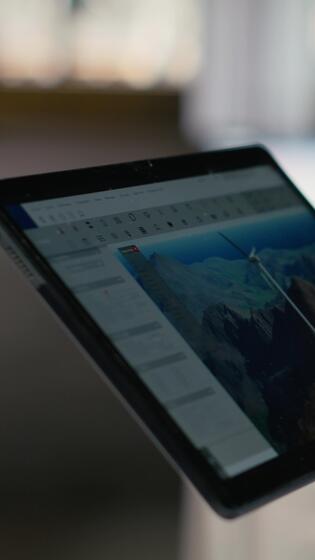 Close up of engineer in office using tablet to work on wind turbine CAD design, doing sustainable energy research. Worker doing digital modeling of wind energy generator gear on device, camera B Pro Video