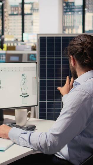Sustainability RD expert uses CAD program on PC to design production lines for solar panel assembly. Worker runs simulation tools to enhance solar cells, accelerating clean energy adoption, camera A Pro Video