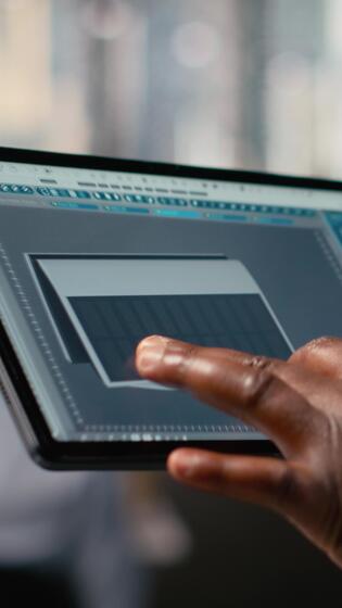 Close up of RD office employee uses touchscreen device, creating eco solar gadget prototype. Engineer using tablet to create solar powered device design with alternative energy technology Pro Video
