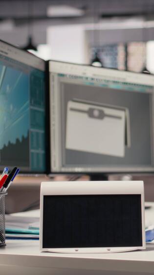 Close up solar powered device developed by technician at work using advanced materials and design. Solar gadget on desk created by RD worker to improve environmental conservation efficiency, camera A Pro Video