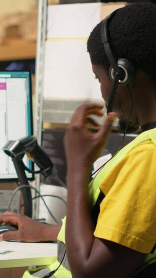 Vertical Black call center operator assisting a client with order mix up problems, verifying parcel status on package tracking software in the warehouse facility. Customer service dispatch support. Camera B. Pro Video