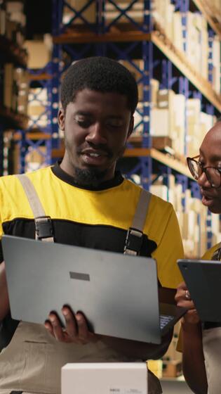 Vertical Black team members handling package data on laptop for order processing in logistics hub, verifying pallets shipping labels for distribution protocols. Efficient e-commerce warehouse. Camera B. Pro Video