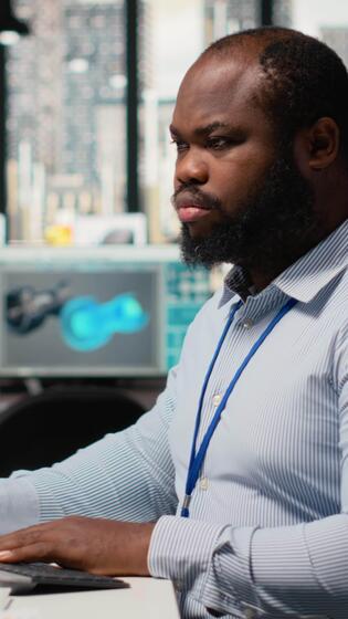 Engineer in office working on power lines pole CAD design to develop technology improving environmental performance. RD expert coming up with innovative materials for transmission tower, camera B Pro Video