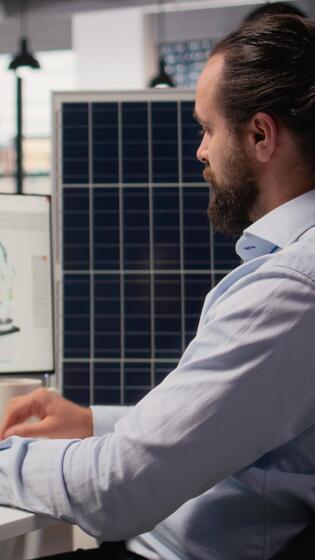 RD department researcher looking over documentation files to study solar green energy systems. Engineer using CAD software on PC to improve photovoltaics carbon footprint, camera A Pro Video