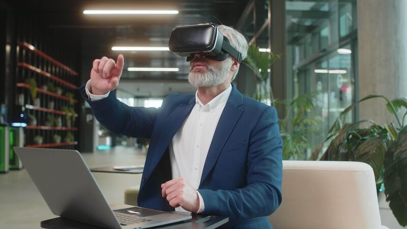 Mature businessman programmer software developer using headset app making a presentation. Watching virtual reality 3D 360 . Bearded gray-haired guy in suit in VR goggles working at office lobby. Pro Video