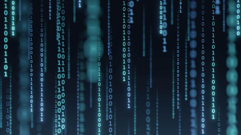 Digital binary code streams down against a dark backdrop in a loopable 3d animation. Pro Video