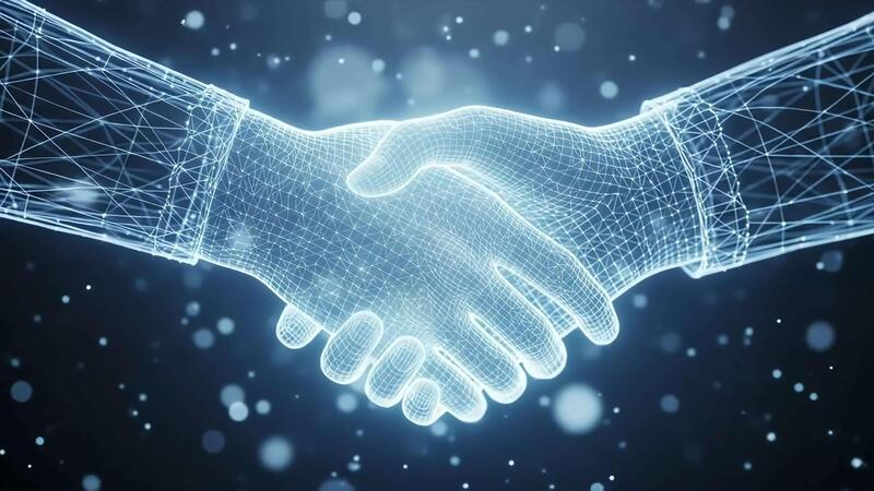 A vibrant digital wireframe handshake symbolizes global technological connection and future collaboration in a virtual space. Free Video