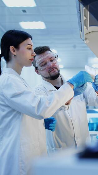 Vertical . Analyzing samples and genetic material using special devices in a modern laboratory. Scientists working in a laboratory with modern equipment. Pro Video