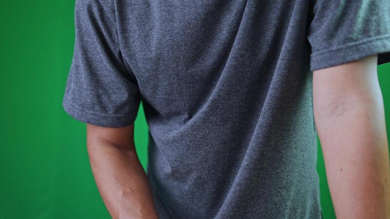 a man appearing to be preparing to work, picking something up, in a gray t-shirt stands in front green screen, or in the middle of an action. for editing and presentations Pro Video