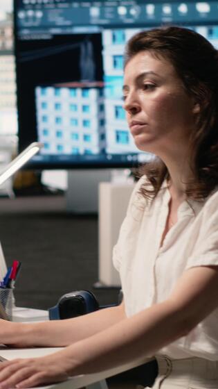 Vertical Property developer analyzing real estate blueprints and infrastructure design with software tools, planning residential expansion and layout with walls structure for new construction. Camera B. Pro Video